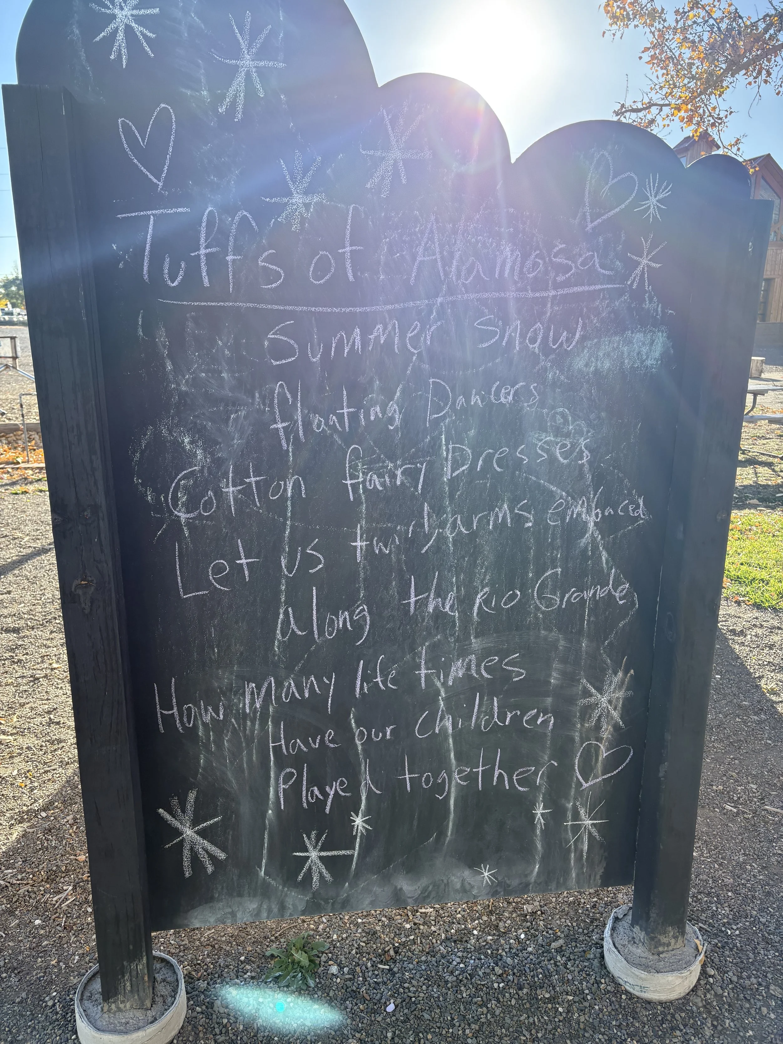 The installation includes seven murals depicting different aspects of the San Luis Valley, two of which represent the communities of the Rio Grande Farm Park and the Boys & Girls Club of the San Luis Valley. Over the summer of 2021, two large chalkboard panels were installed with the intention that visitors to leave their mark on the park through personal drawings, poems, and stories.
