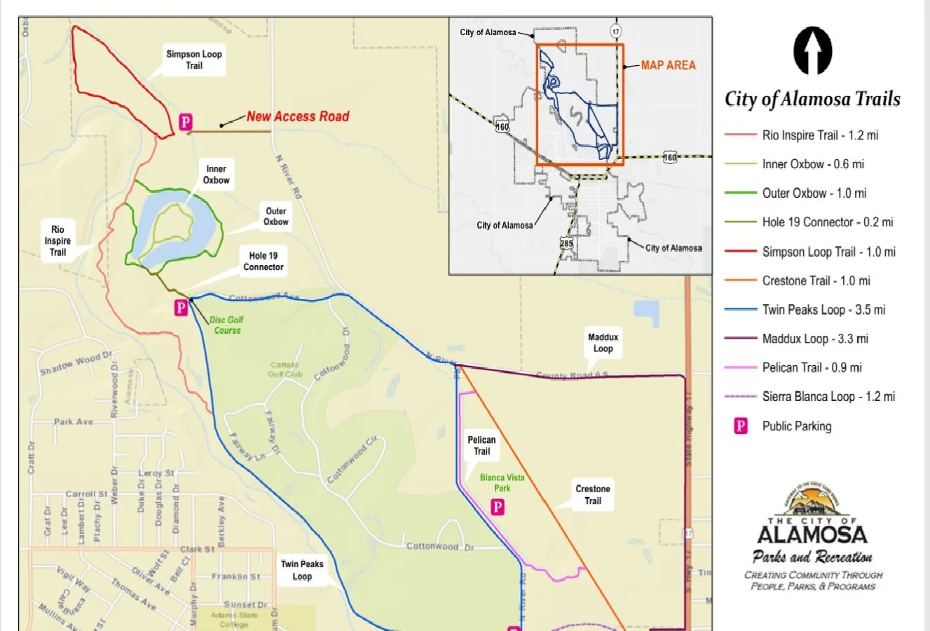 The Rio Grande Farm Park is a wonderful destination for exploration along the City of Alamosa’s expansive trail system. The front gate of the park is connected to the bike pathway along Highway 17. The back gate leads to our laguna, which sits right next to the city trail that runs alongside the beautiful Rio Grande River. On the map below, our back entrance is located on the Maddux Loop Trail, which is just steps away from the Rio Grande Trail network.