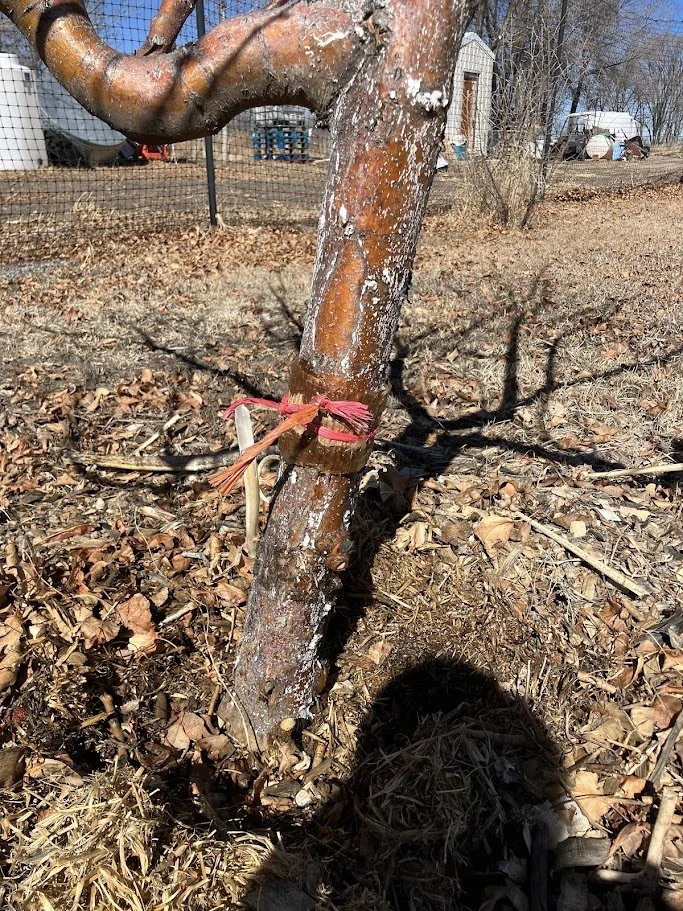 Volunteers wrapped and waxed around the bases of our fruit trees in the orchard to prevent apple maggot damage come springtime.